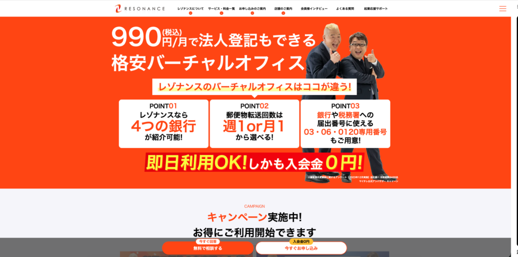 「費用をかけず、法人登記できる住所のレンタルがしたい」という方には、レゾナンスがおすすめです。