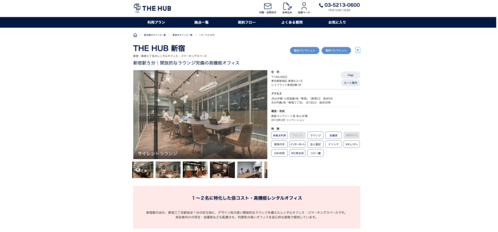 THE HUBは全国に71店舗を展開する、レンタルオフィス界の大御所です。各拠点にはおしゃれで心地よいラウンジが用意されており、オフィスや会議室、コワーキングスペースなどの快適性も重視されています。さらに、提携しているオフィスやスペースの数は1,000か所以上あり、バーチャルオフィスプランの契約であっても利用が可能です(利用料別途)。