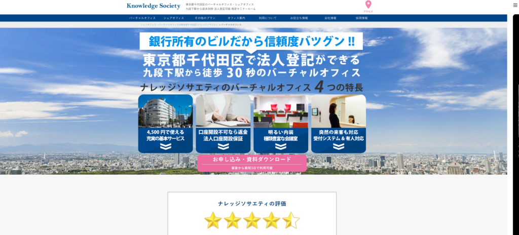ナレッジソサエティは、東京都の千代田区九段に位置するバーチャルオフィスです。ビジネスのサポートに力を入れており、セミナーや交流会などを積極的に開催しています。