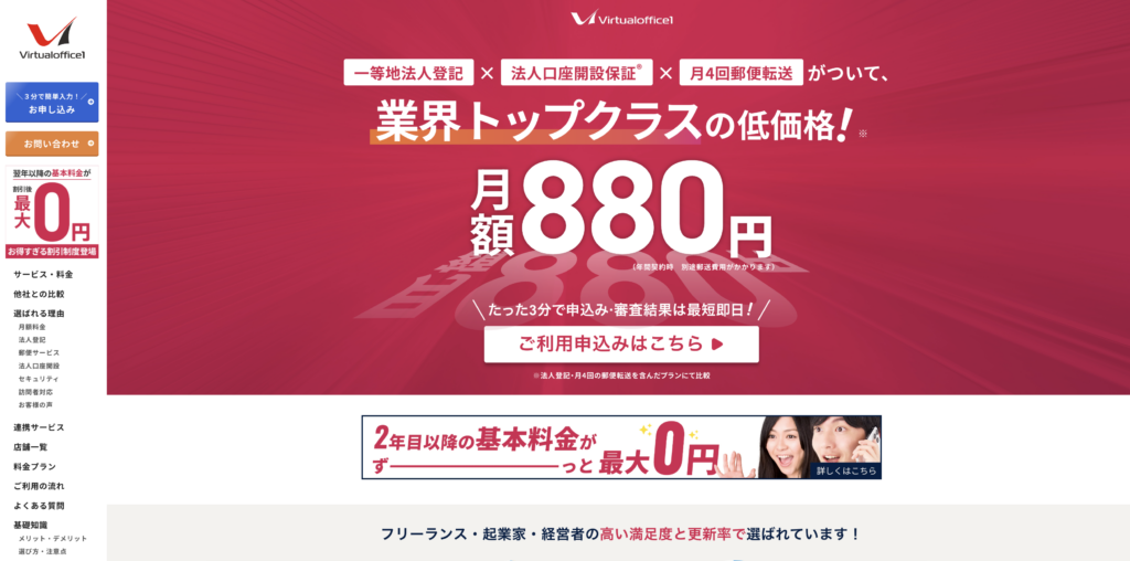 バーチャルオフィス1は、月額880円から利用できるコストパフォーマンスの良さが魅力です。