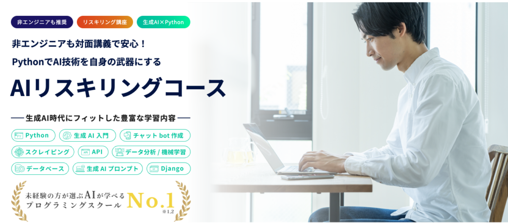 主な特徴 | ・対面指導によるマンツーマン学習 ・Python・GPTを中心としたAIプログラミング講師がカリキュラムを作成し、実践的に指導 ・受講期間は4〜6か月から選択可能 |
