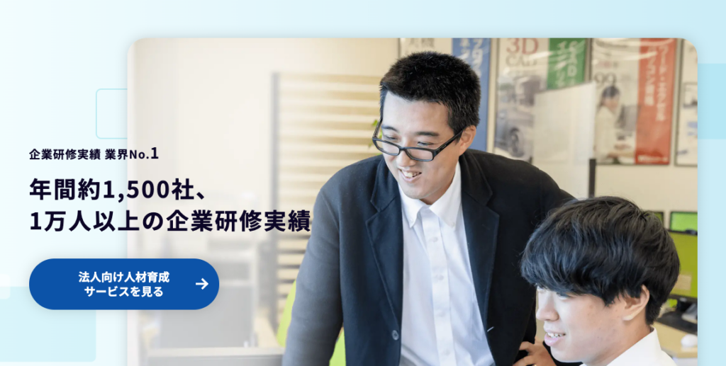 主な特徴 | ・全国展開しており通学も可能、オンラインとの併用もできる ・AI・生成AI・ビジネスソフトなど多様なコースを展開 ・個別レッスン形式で初心者にも対応しやすい ・法人研修実績が多く信頼性が高い |