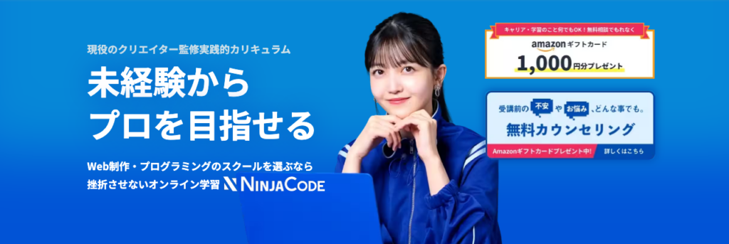 忍者codeは、Web制作スキルを中心に学べるオンラインスクールです。独学プランからフリーランス特化型プランまで幅広く用意されており、自分のレベルや目的に合わせて選べます。