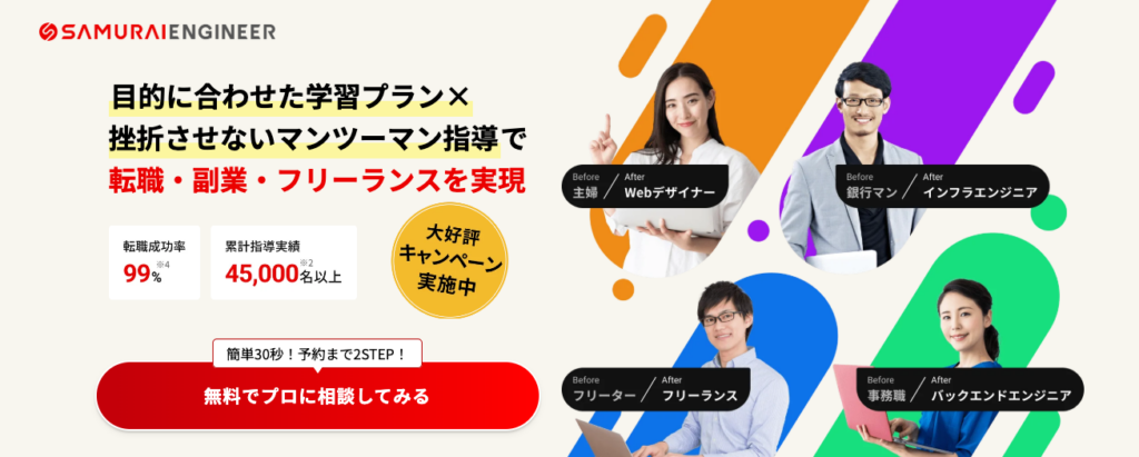 SAMURAI ENGINEERは、専属インストラクターによるマンツーマンサポートを強みとするオンラインスクールです。